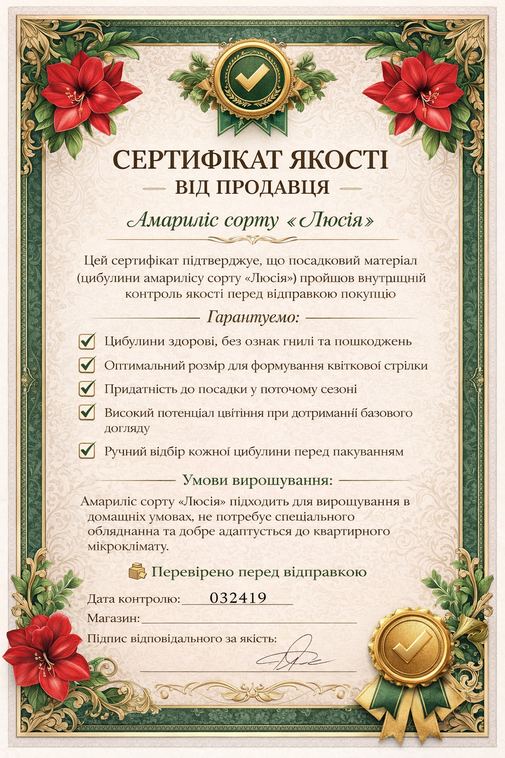 Ми відправляємо тільки перевірені, сертифіковані цибулини амарилісу,