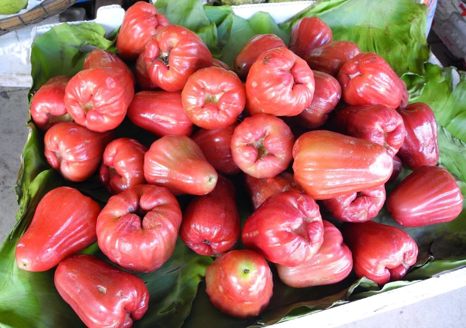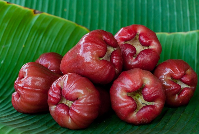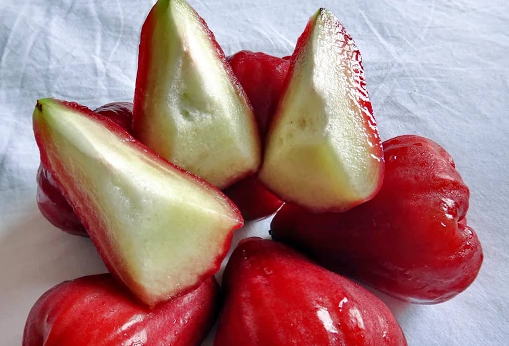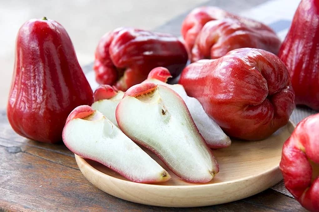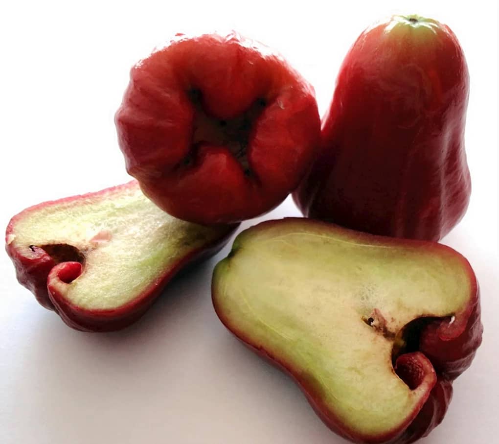 Плоди джамбози розміром із середнє яблуко. Бувають жовтого, рожевого і червоного кольору, різної насиченості.