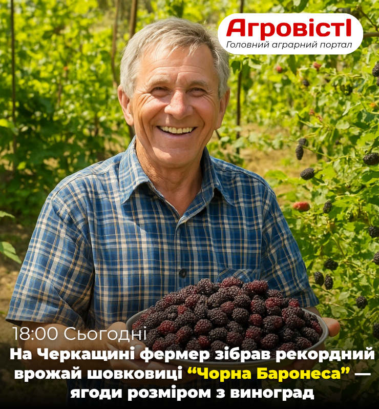Черкаська область, 11 серпня 2025 року — Фермер із Черкащини Микола Гончар зібрав рекордний урожай шовковиці сорту “Чорна Баронеса”, отримавши понад 35 кг ягід з одного дерева. Плоди вражають розміром — до 4,5 см у довжину, насиченим темно-фіолетовим кольором та медовим смаком з легкою кислинкою.