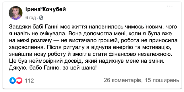 Зараз баба Ганна вже не може приймати всіх охочих особисто через вік і стан здоров'я. Тому вона продовжує допомагати людям онлайн, передаючи свої настанови та проводячи ритуали на удачу на відстані.